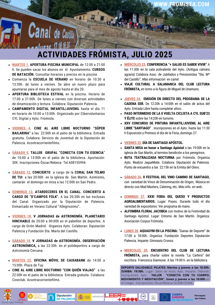 La programación estival del Verano ya está organizada desde el Ayuntamiento De FrómistaComenzamos por las actividades del mes de julio, con cine, música, teatro, festivales y un programa de dinamización para niños y jóvenes. Este verano, te esperamos en Frómista.